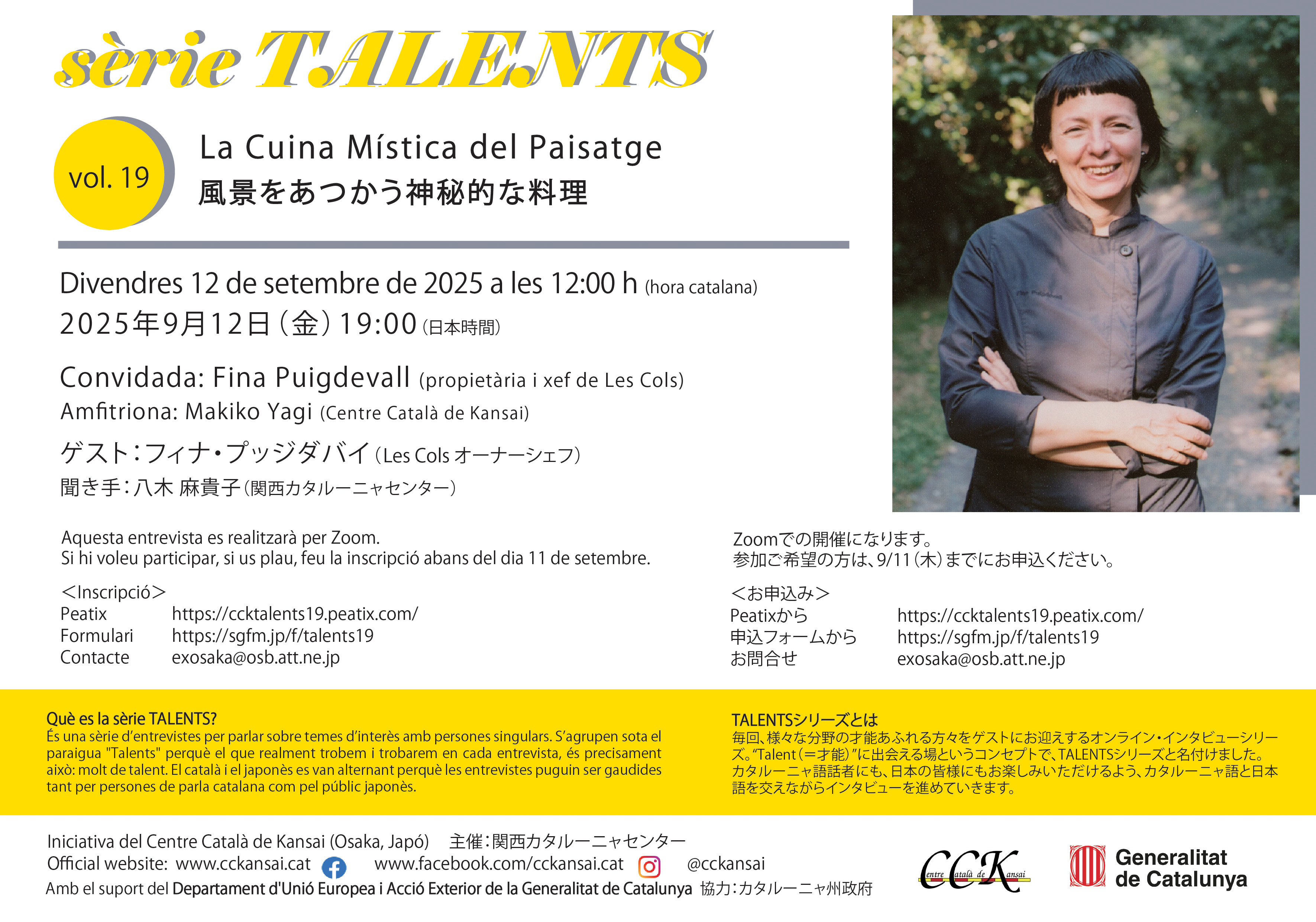 日時:9月12日(金)日本時間19:00(カタルーニャ時間12:00)より主催:関西カタルーニャセンターゲスト:フィナ・プッジダバイ (Les Cols オーナーシェフ)使用言語:カタルーニャ語と日本語開催形式:Zoomミーティング ※要事前申し込み申込先:9月11日(木)までに以下のいずれかにて Peatixから:https://ccktalents19.peatix.com/ 申込フォームから:https://sgfm.jp/f/talents19 ※お申し込みの方には、Zoomミーティングへの招待をお送りします。参加費用:無料(ライブ配信のみ)と応援チケット(500円)から選択 「無料(ライブ配信のみ)」は、録画をご覧いただけません。 後日、録画をご覧にいただくには「応援チケット」をお選びください。Folleto TALENTS#19.jpg**************