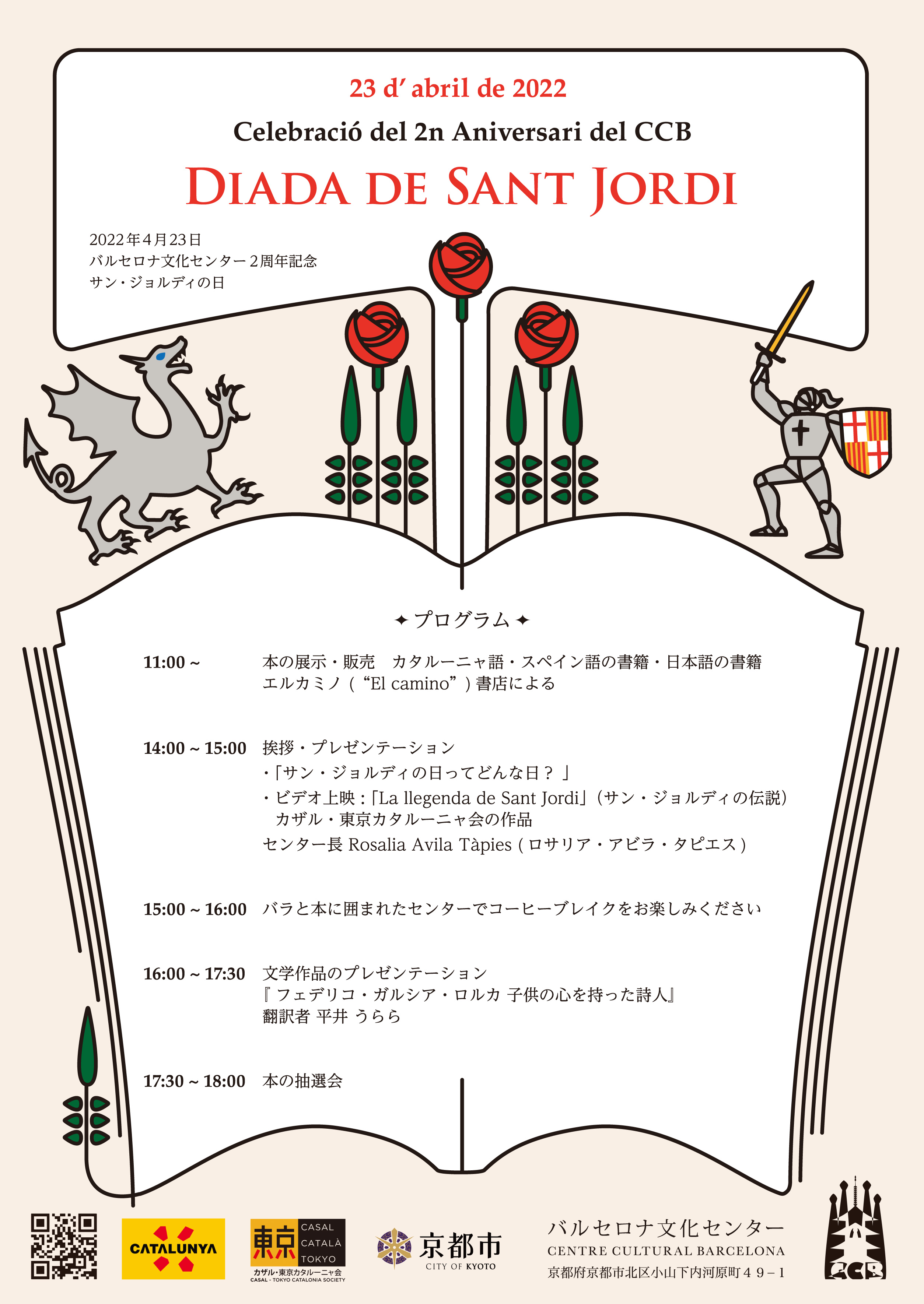 北大路と賀茂川が交差するあたりに位置するバルセロナ文化センターでは、4月23日のサン・ジョルディの日を記念したイベントを開催します。詳細はチラシを参照してください。